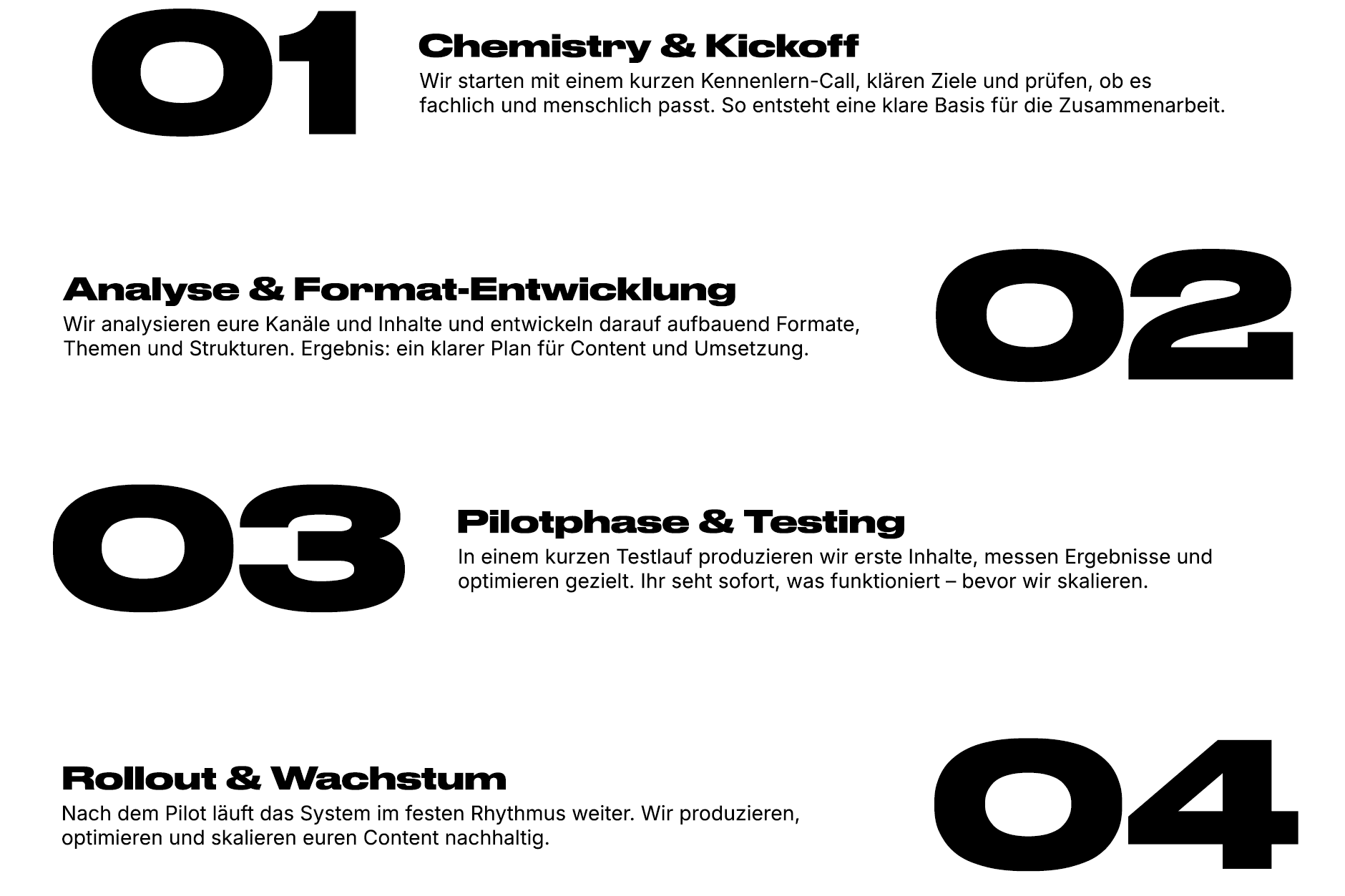 Wir analysieren Ihre Marke, Zielgruppe und Kanäle und schaffen Formate. Daraus entstehen Skripte und klare KPIs, damit jedes Asset einen Zweck erfüllt.